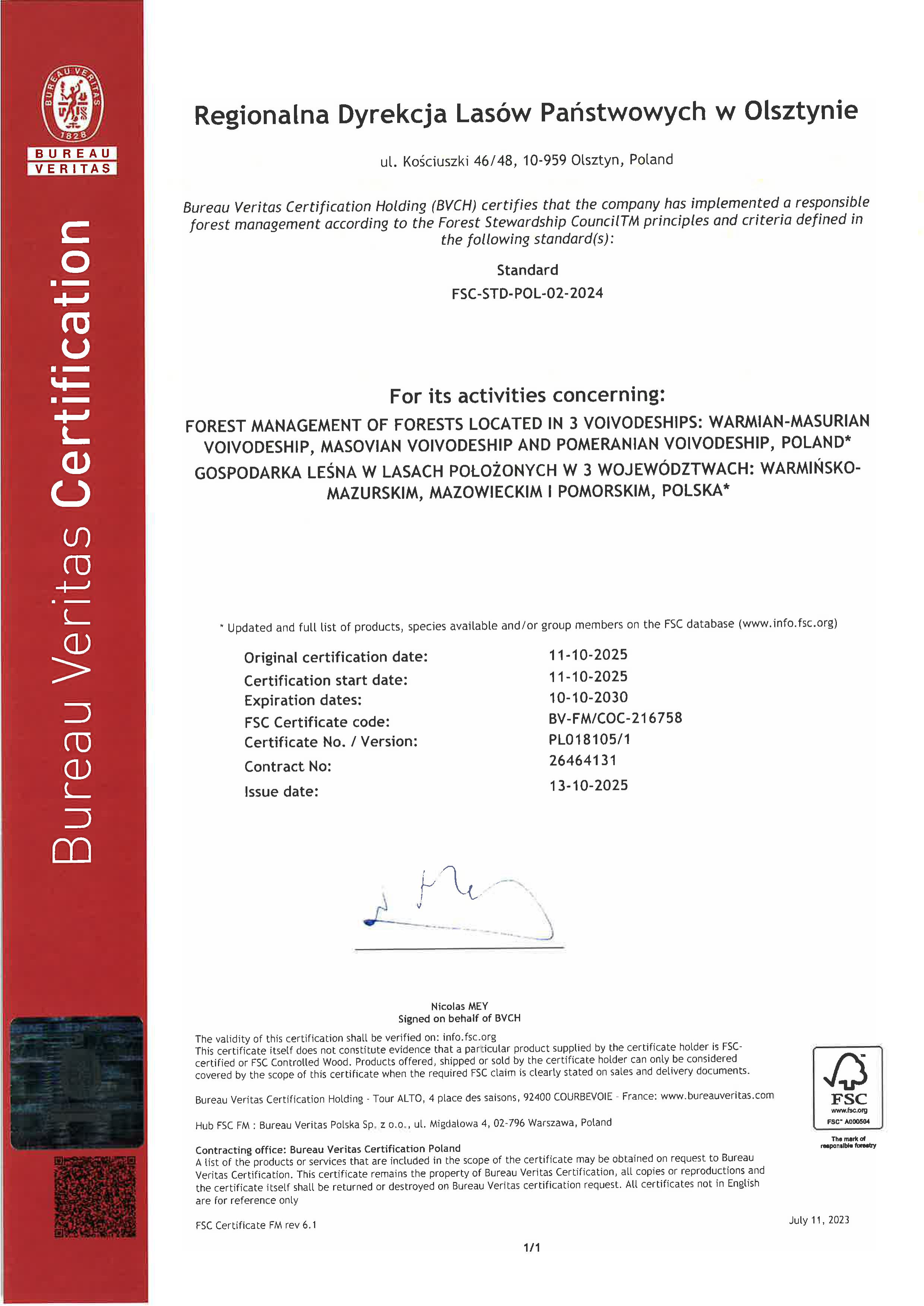 Certyfikat RDLP w Olsztynie został wydany 11 października 2025 roku i zachowuje ważność do 10 października 2030 roku (numer certyfikatu: BV-FM/COC-216758, PL018105/1).